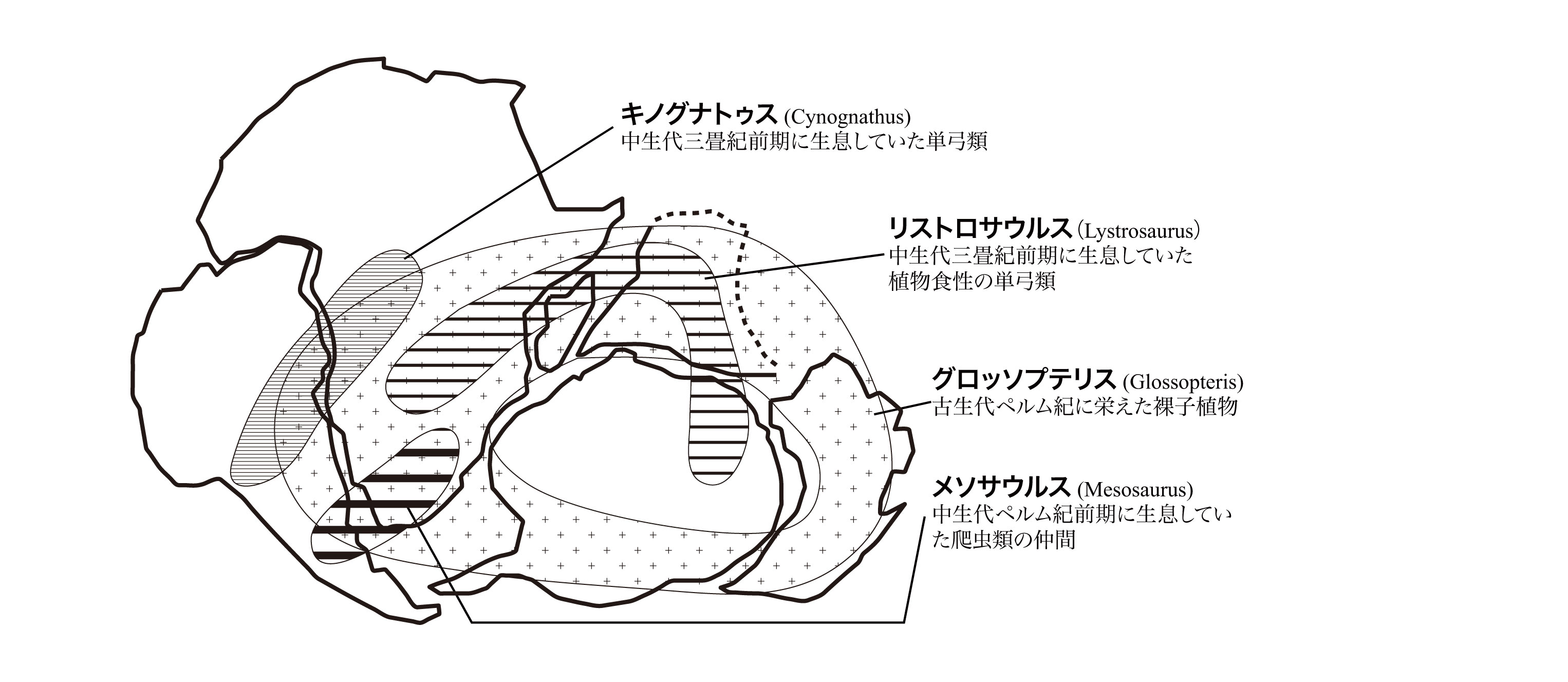 【2-1】大陸移動説に基づいて大陸を復元した際の、古生代?中生代の生物の分布 >>> こちら