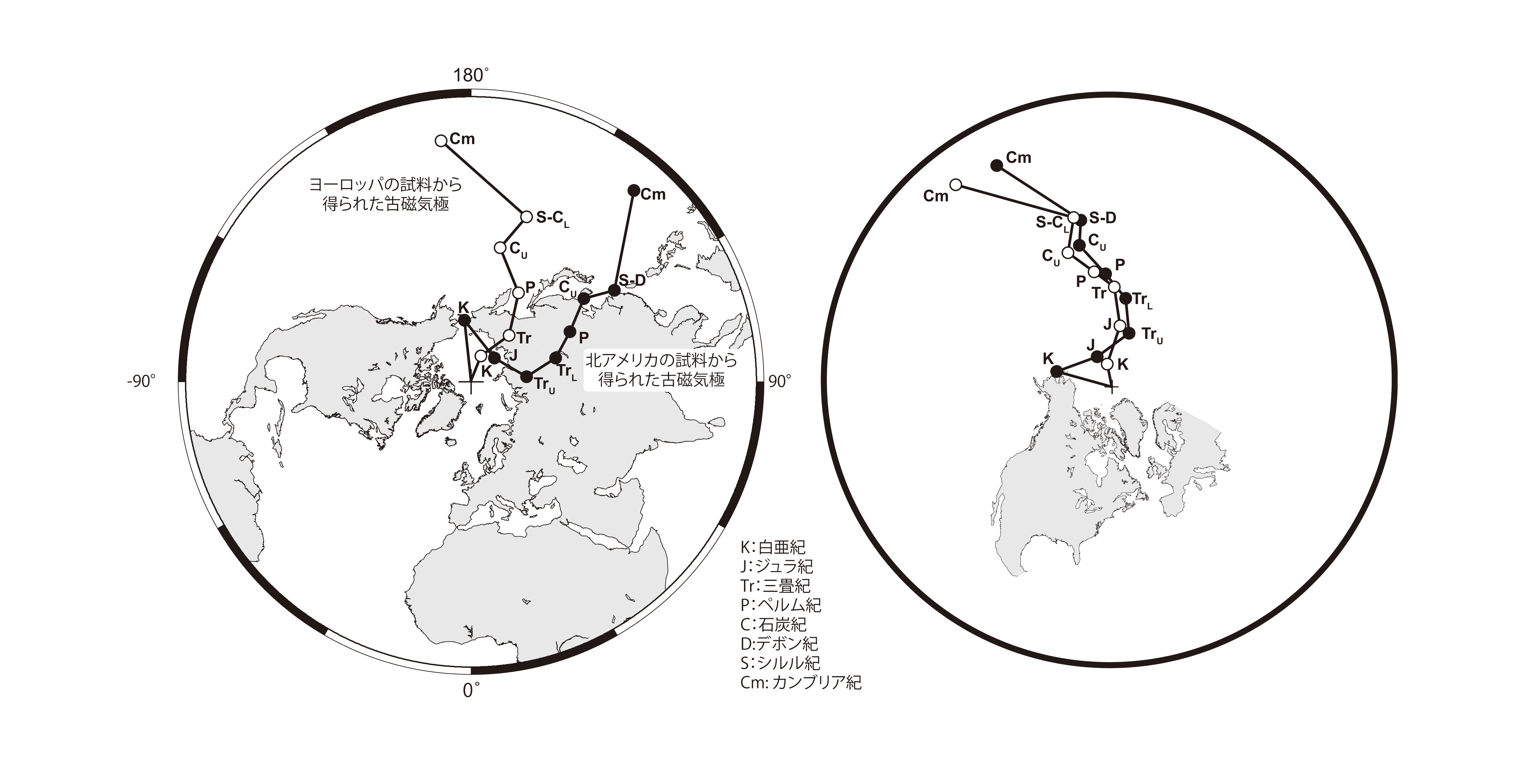 【2-11】北アメリカ(●)とヨーロッパ(○)から得られた試料から求められた過去の地磁気極の移動 >>> こちら