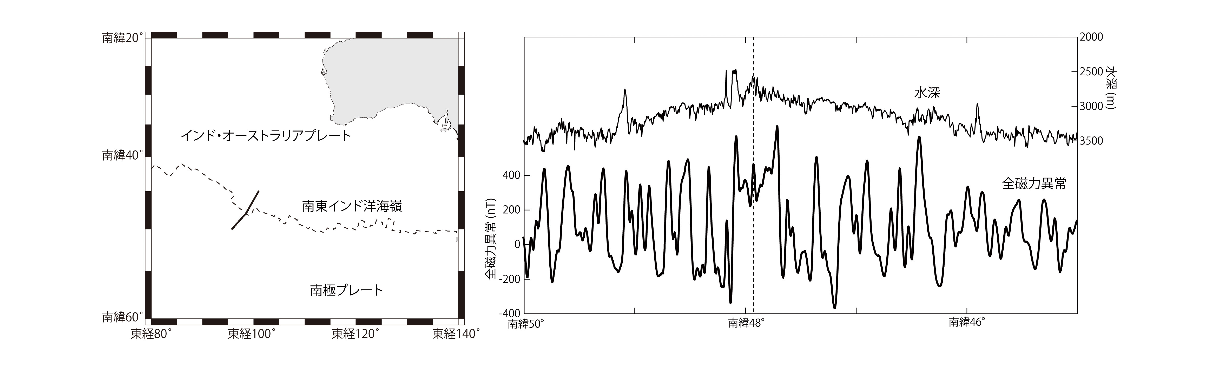 【2-13】南東インド洋海嶺を横切る観測線に沿う磁気異常のパターン >>> こちら