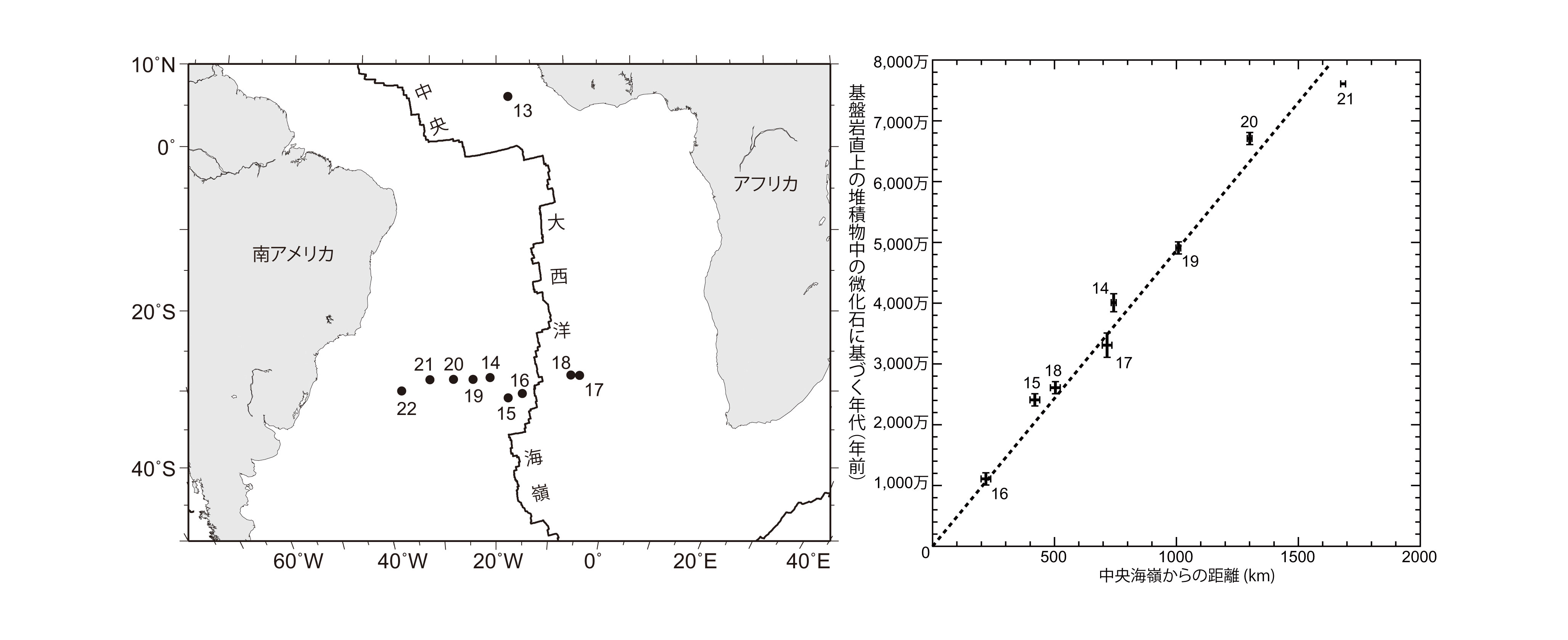 【2-15】中央大西洋海嶺(Mid-Atlantic ridge)を挟む海底をボーリングして得られた海底の形成年代 >>> こちら