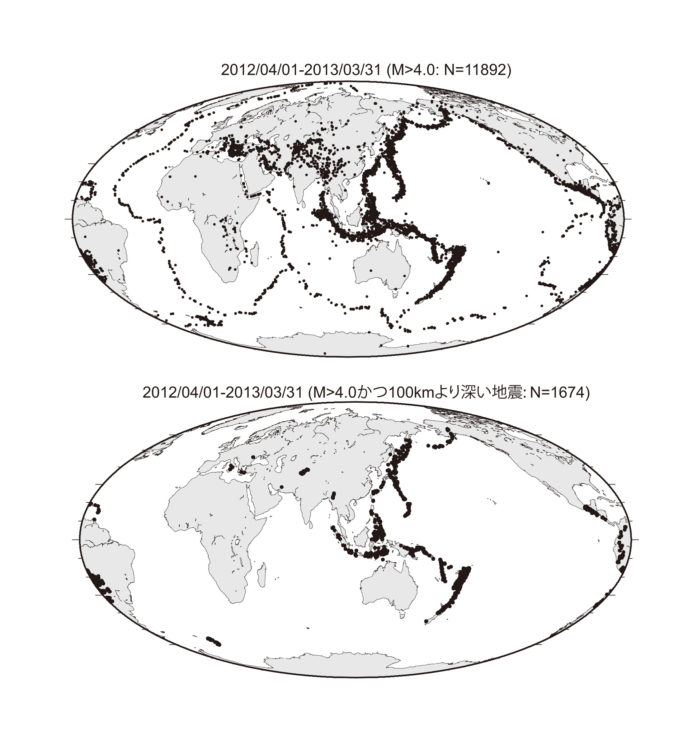 【2-17】2012年4月1日から2013年3月31日までに地球上で発生した、M4以上の地震の震央分布 >>> こちら