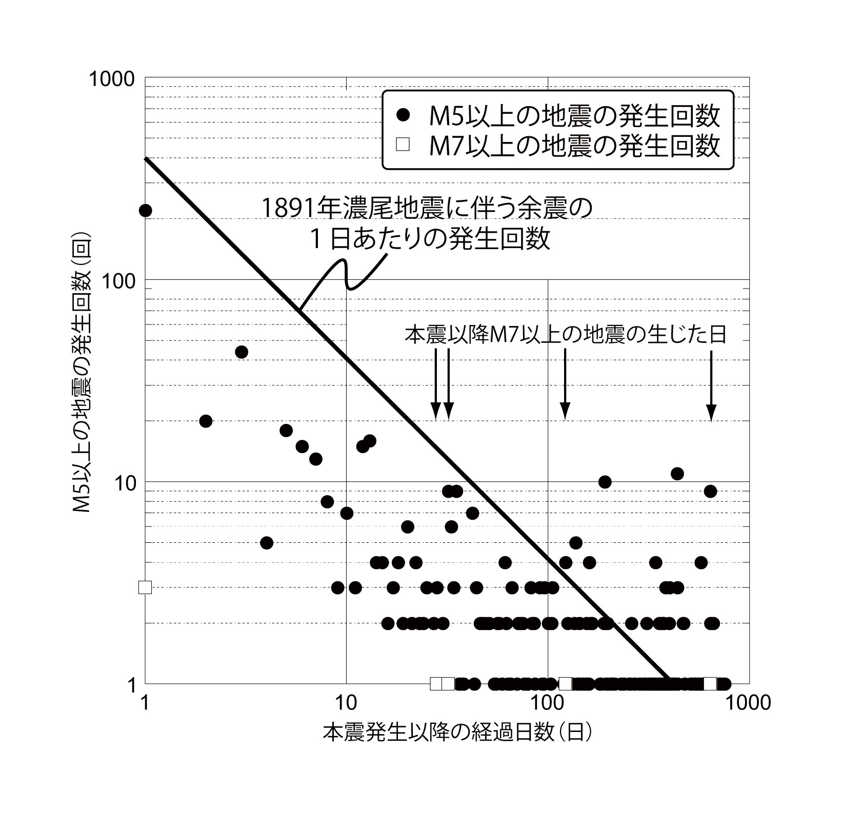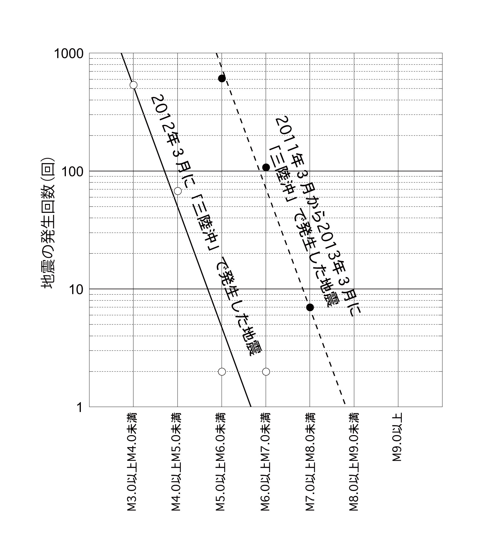【3-19】震央地「三陸沖」において、2011年3月から2013年3月までに発生した地震(●)と2012年3月に発生した地震(○)のM毎の発生回数 >>> こちら