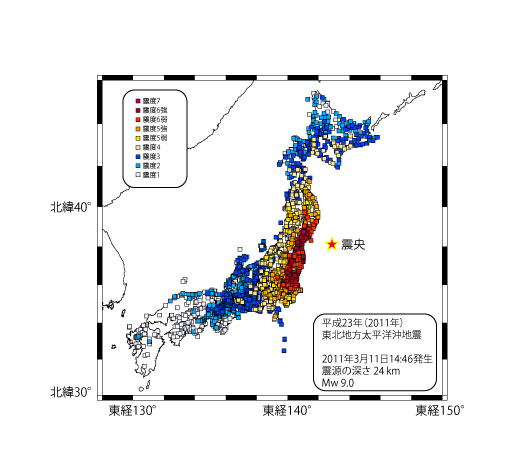 【3-4】平成23年(2011年)東北地方太平洋沖地震の際の震度分布 >>> こちら