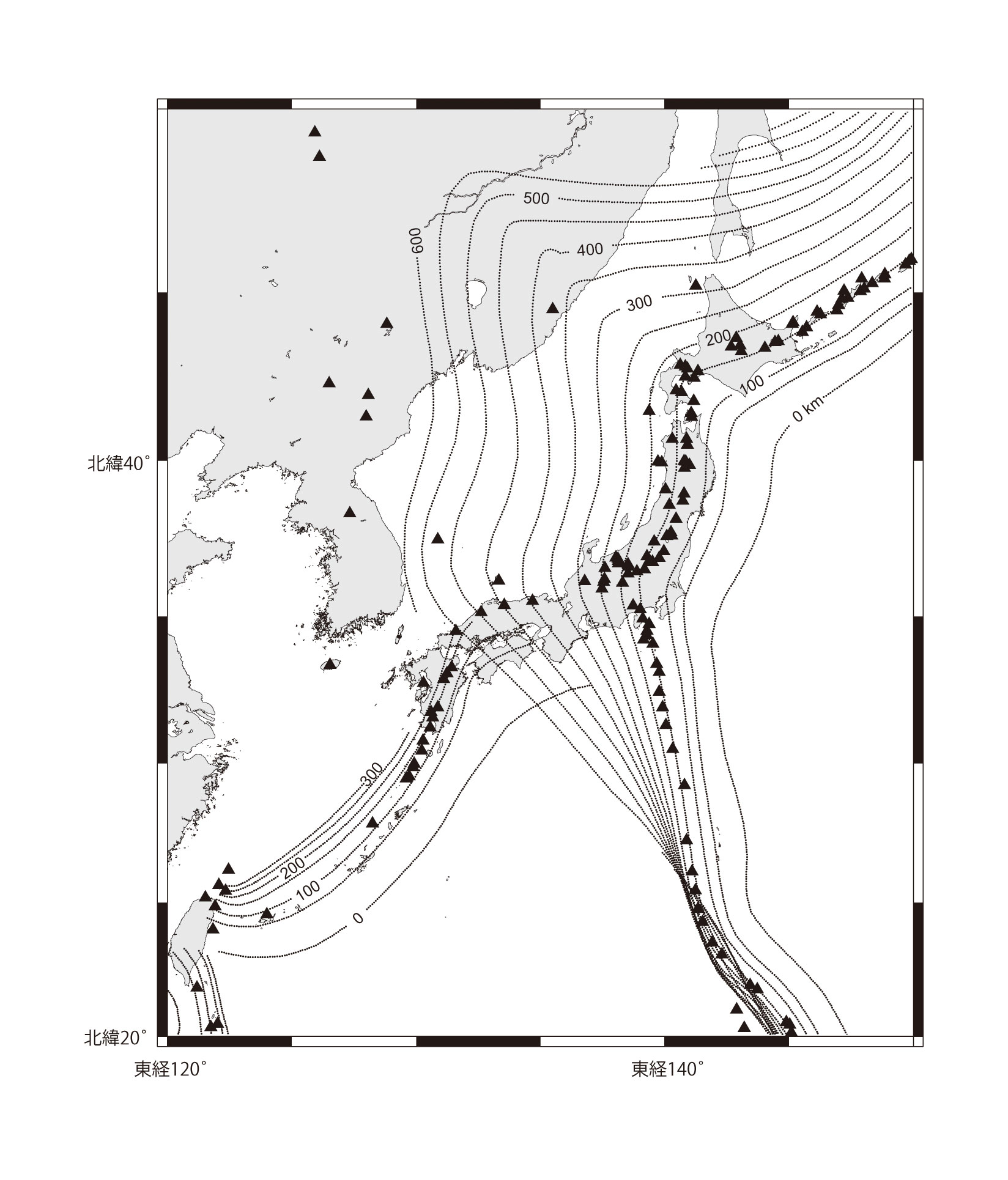 【4-10】日本列島周辺での火山(▲)の分布と沈み込んだプレートの深さ >>> こちら