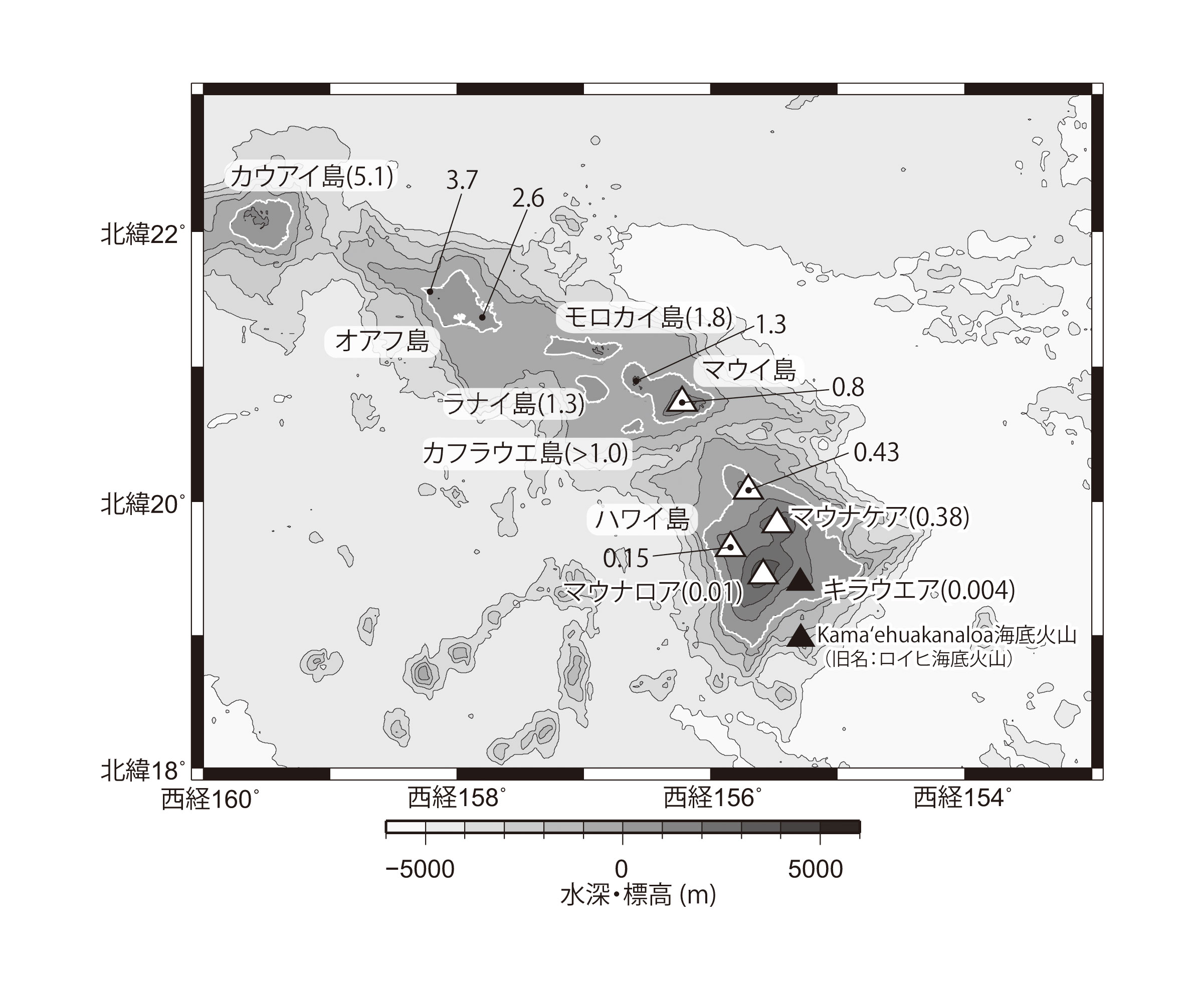 【4-17】ハワイ諸島周辺の地形の様子と主な火山の分布 >>> こちら