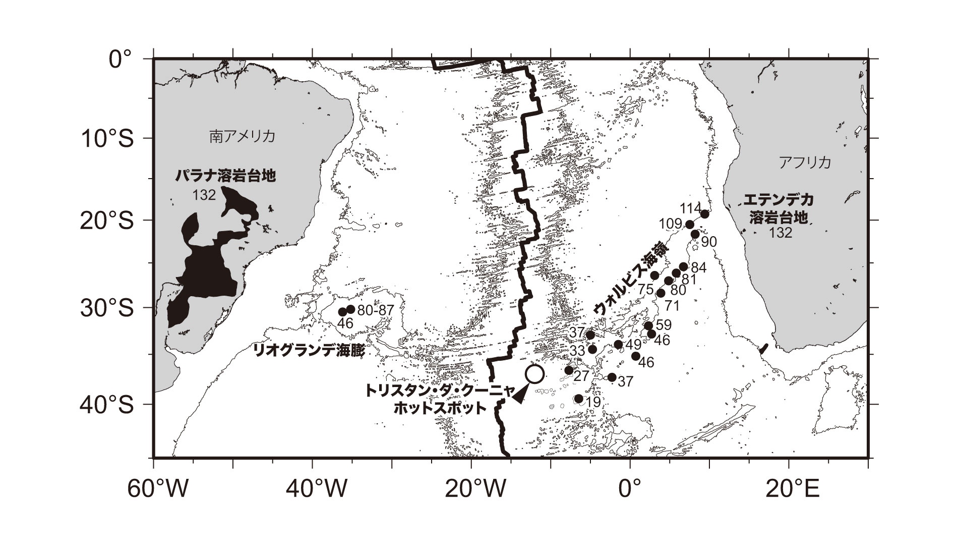 【4-21】南大西洋のトリスタン・ダ・クーニャホットスポットとパラナ台地、エテンデカ台地およびリオグランデ海膨、ウォルビス海嶺の位置関係。 >>> こちら