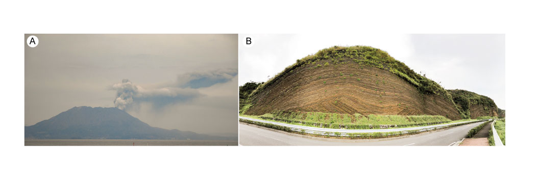 【4-22】(A)鹿児島県桜島の噴火の様子(2011年3月) (B)伊豆大島で観察される火山砕屑物の地層(「地層切断面」バス停付近) >>> こちら