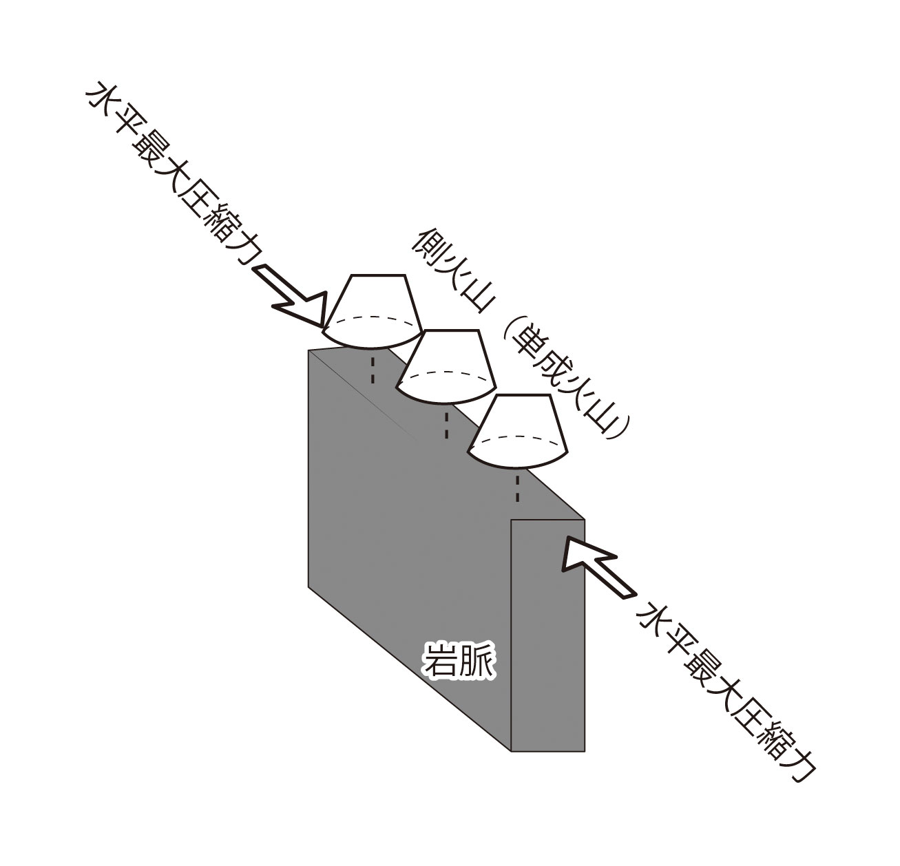 【4-26】圧縮の応力とそれによって形成される割れ目の向きの関係 >>> こちら