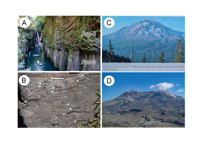 【4-28】(A)阿蘇火山由来の火砕流堆積物 Aso-3は約12万年前の火砕流、Aso-4は約9万年前の火砕流。固結する際に発達した柱状節理が顕著である。宮崎県高千穂峡・真名井の滝にて。(B)Aso-3に発達する溶結したガラス(白矢印) >>> こちら