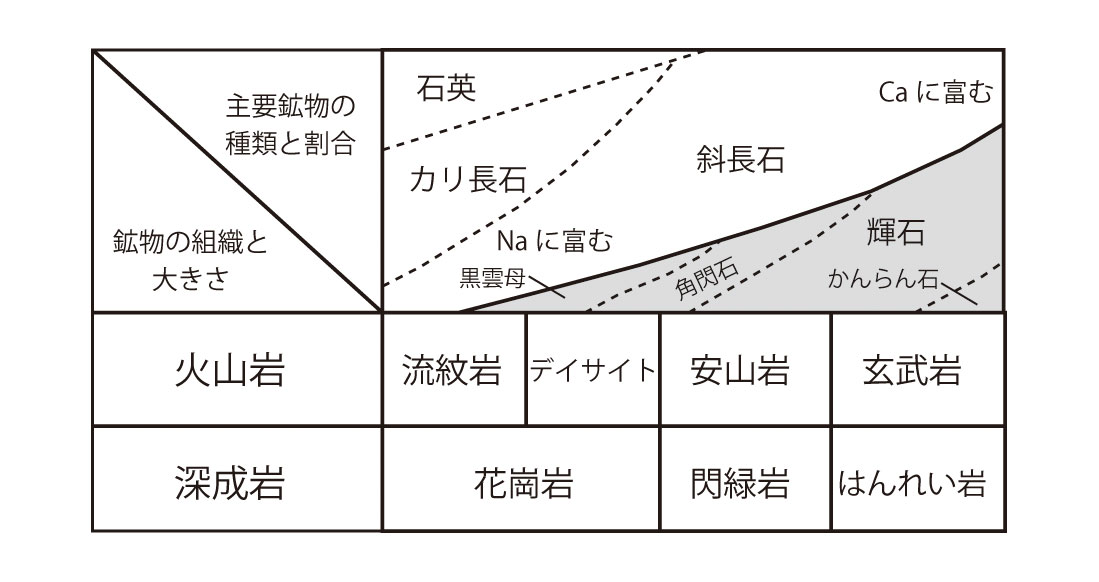 【4-3】組織と構成鉱物の割合に基づいて火成岩を区分した図 >>> こちら
