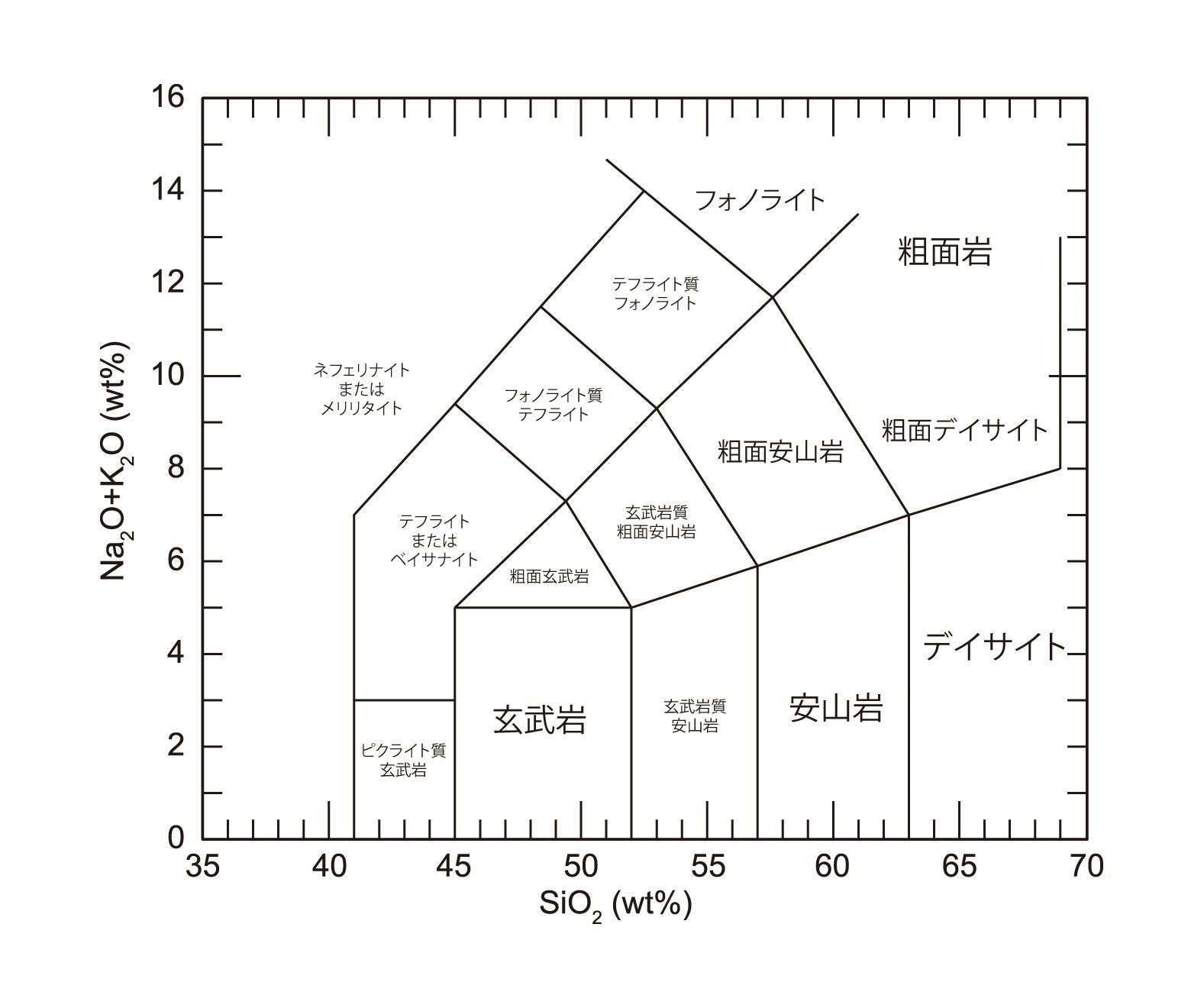 【4-4】火山岩の化学組成のうち、横軸に二酸化ケイ素(SiO2)、縦軸に酸化ナトリウム(Na2O)と酸化カリウム(K2O)の含有量(重量パーセント)をプロットすることで火成岩を分類する図 >>> こちら