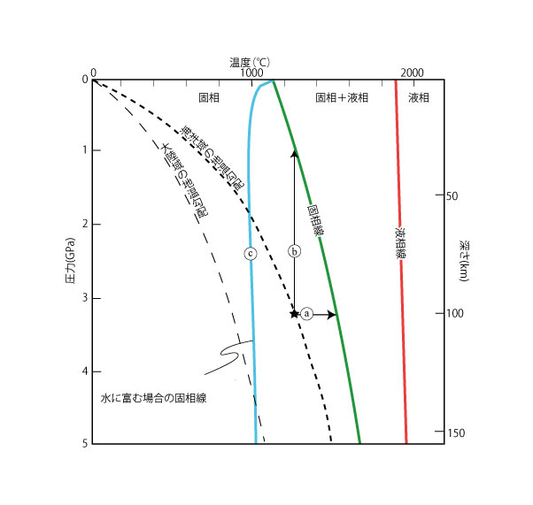 【4-5】固体地球浅部の温度・圧力とマントルの岩石が融解する条件を示した図 >>> こちら
