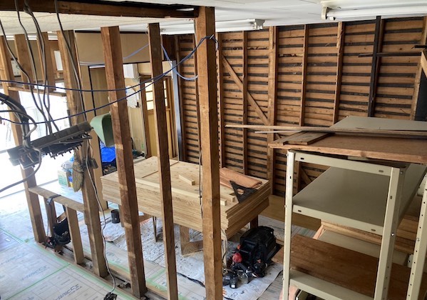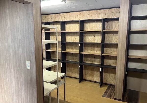 | 冒頭でお伝えした、社屋の工事の様子。厳しい暑さのなか、壁や柱が着々と刷新されています。6月末には事前準備として、在庫や改装用のカバーを大工さんとスタッフ総出でバケツリレーしました。日々の出荷作業で重い本を運んでくださっている営業スタッフさんや流通の皆様に感謝。ちなみにこの建物、一時期「足袋」の卸売会社だったことがあり、壁一面に備え付けの棚は、そのときに作られたものなのだそうです。